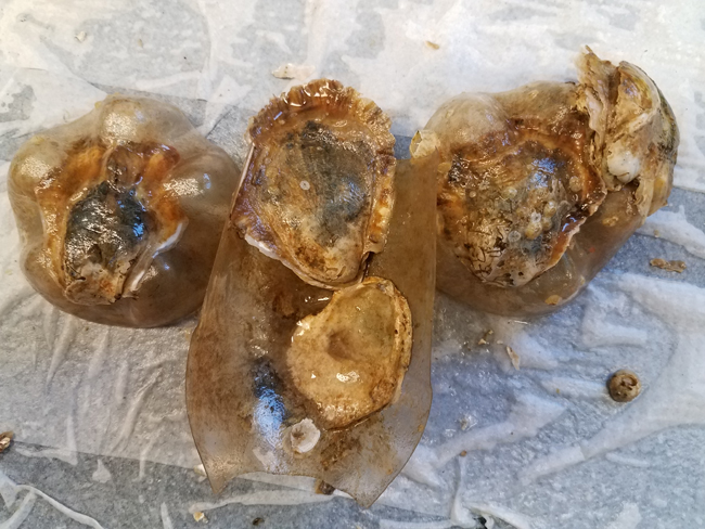Oysters that have been reared on plastic. Credit: Laura Eierman