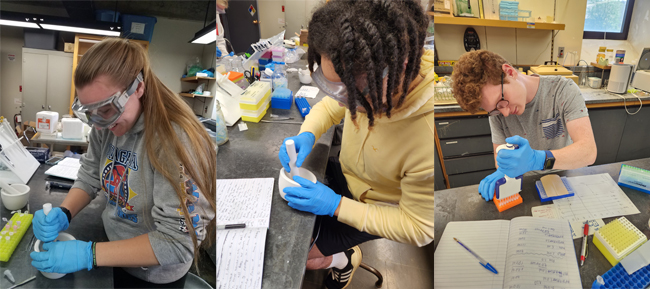 (at left) Undergraduate student Marissa Kordal (SUNY Cortland '22) grinds frozen oyster gill tissue during an RNA extraction; (in middle) Undergraduate student Keolani Savage (SUNY Cortland '26) grinds frozen oyster gill tissue during an RNA extraction. Keo completed this work as part of a Louis Stokes Alliance for Minority Participation summer fellowship; (at right) Undergraduate student Makiah Poli uses a multichannel micropipette to set up quantitative polymerase chain reaction (qPCR) experiments to measure changes in gene expression in oyster tissue from exposure to plastic pollution. Credit: Laura Eierman