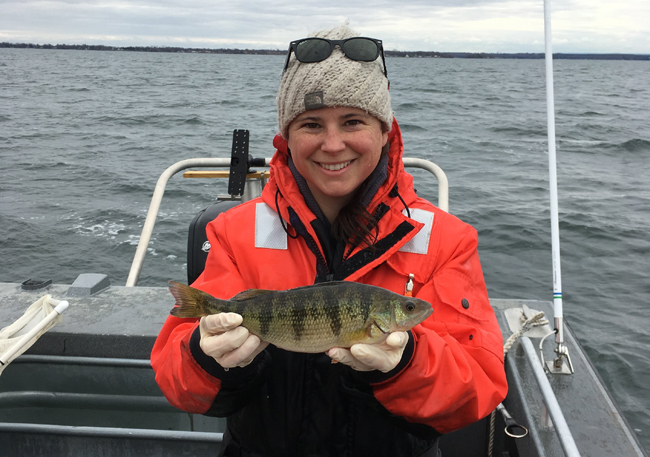 SUNY Oswego Assistant Professor Ellen Karboski, Ph.D., will highlight a collaboration with a local fish processor in support of fisheries’ research programs for students as a part of the 2026 Upstate Seafood Summit on April 9th in Oswego, New York. She is seen here with a yellow perch collected from Chaumont Bay. Credit: Ellen Karboski