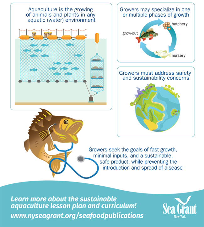 As illustrated in the "Sustainable Aquaculture" (pdf) poster above, NYSG's seafood science and aquaculture curriculum and lesson plans are resources that teachers can use to incorporate the topics into their classroom learning. Credit: Loriann Cody (design); Mike Ciaramella, Chris Gonzales (concept, editing).