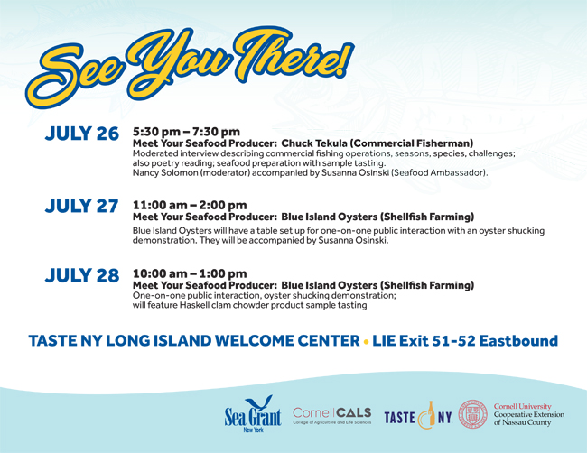 New York Sea Grant is partnering with CCE Nassau County to organize an information desk, which is available throughout July to distribute information about local seafood choices and seafood production, as follows: