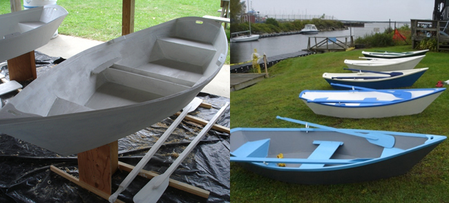 (Above, at right) This dory was built at the 2017 Great New York State Fair by Richard Bush. Here it is primed and awaiting the installation of its center seat. (Above, at left) Richard Bush has taught boat building classes at the H. Lee White Maritime Museum for the past 13 summers. Here is a set of finished work by his students of all ages. Credit: Richard Bush/H. Lee White Maritime Museum.
