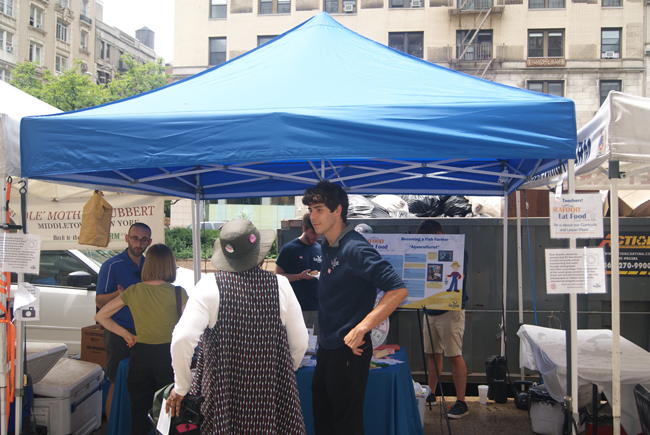 Intern Matthew Tobin (at center) is seen along with NYSG's Seafood Specialist Mike Ciaramella (at back left) interacting with visitors at the NYC Greenmarket event.