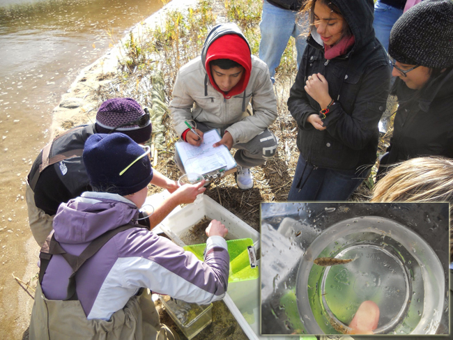 Student stewards from Brentwood High School studying the waters (and inhabitants) of Sunken Meadow Creek at Sunken Meadow State Park in Kings Park, NY, a designated LIS Stewardship Area. Credit: Amy Mandelbaum, NYSG/LISS.