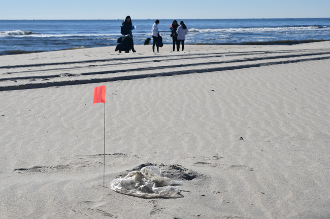High school students record debris items and mark balloon debris for data collection on Jones Beach in Nassau County, N.Y. Credit: NYSG/Krista Stegemann.