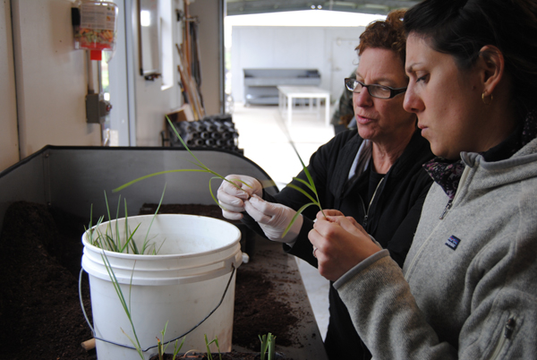 Educator Elizabeth Yanuck-Platt is pictured above with New York Sea Grant's Long Island Sound Study educator Larissa Graham at the Golden Meadow Plant Materials Center, where she and other educators propagated restoration plants including Gulf bluestem by clipping fully-grown ones, placing several clippings in separate sections in a tray and then trimming the clippings to spur additional growth and increase their chances for survival.