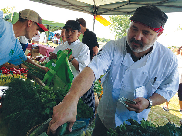 Chefs Kyle Romeo of Jedediah Hawkins Inn (S. Jamesport) and Steven Amaral [seen above shopping for veggies] of North Fork Chocolate Company (Calverton) and Black Tie Caterers (Wading River) were setting up to go “saucepan to saucepan Iron Chef-style, “as described by Eileen M. Duffy, Edible East End editor and one of the seafood throwdown judges.