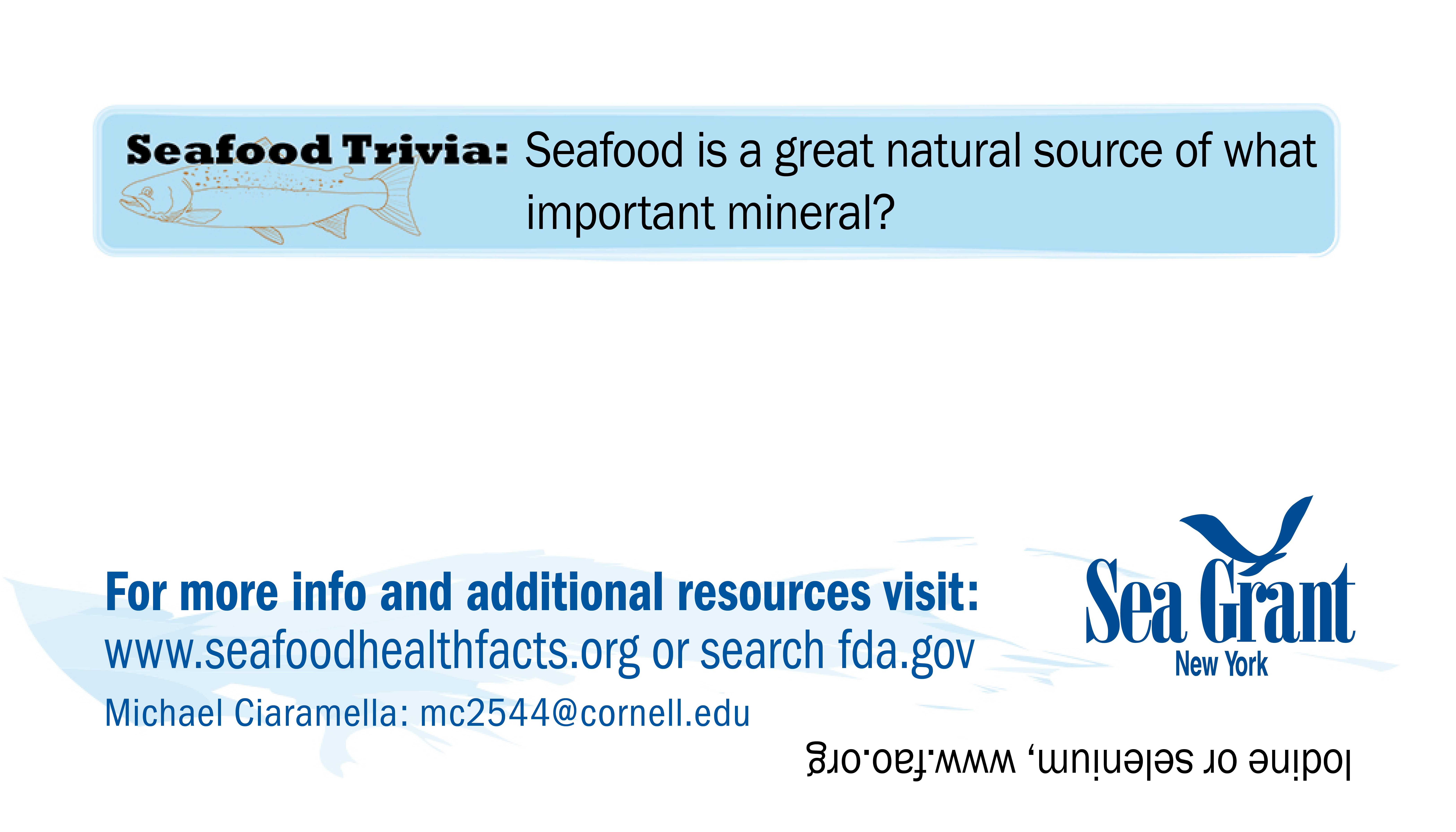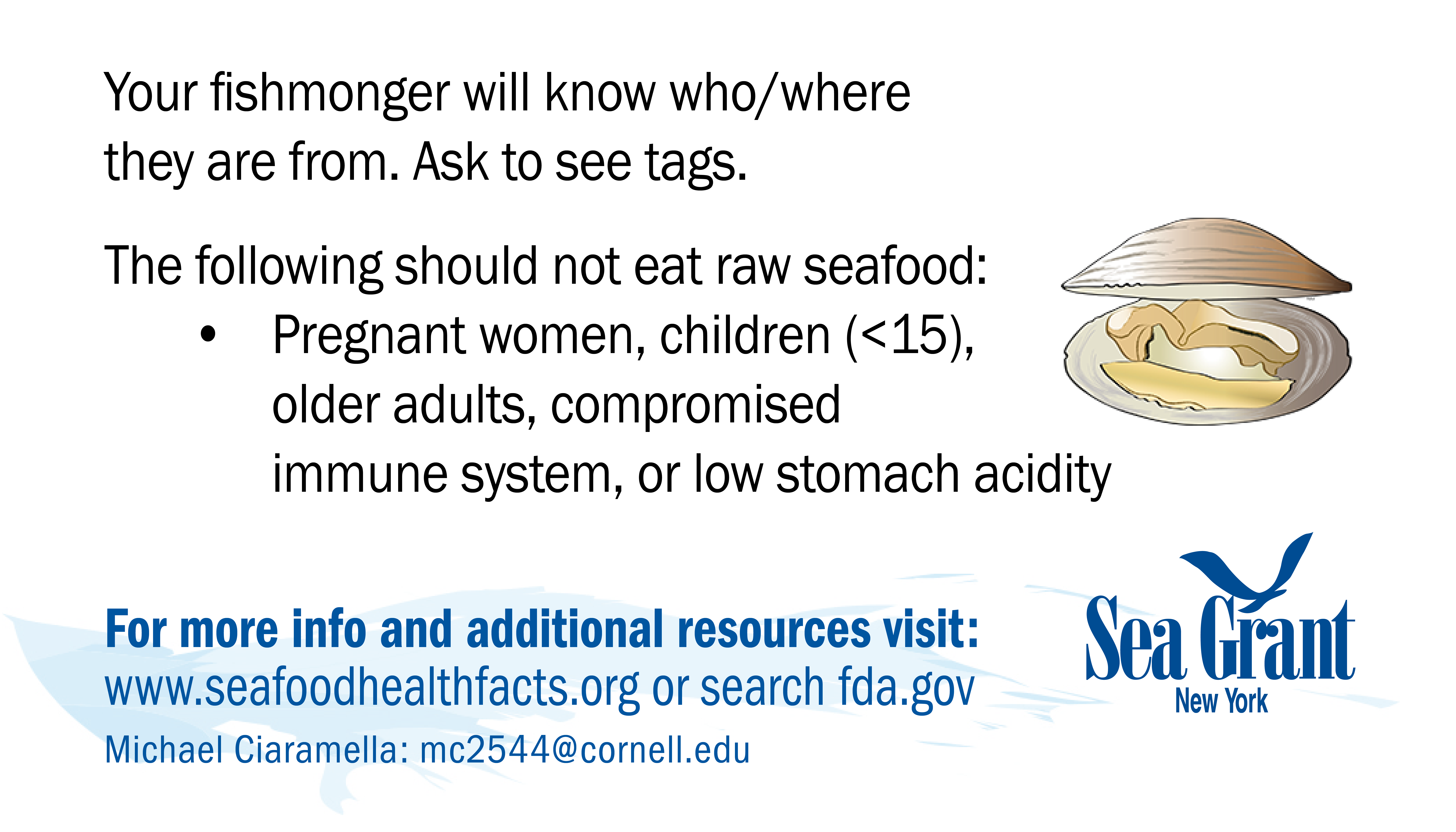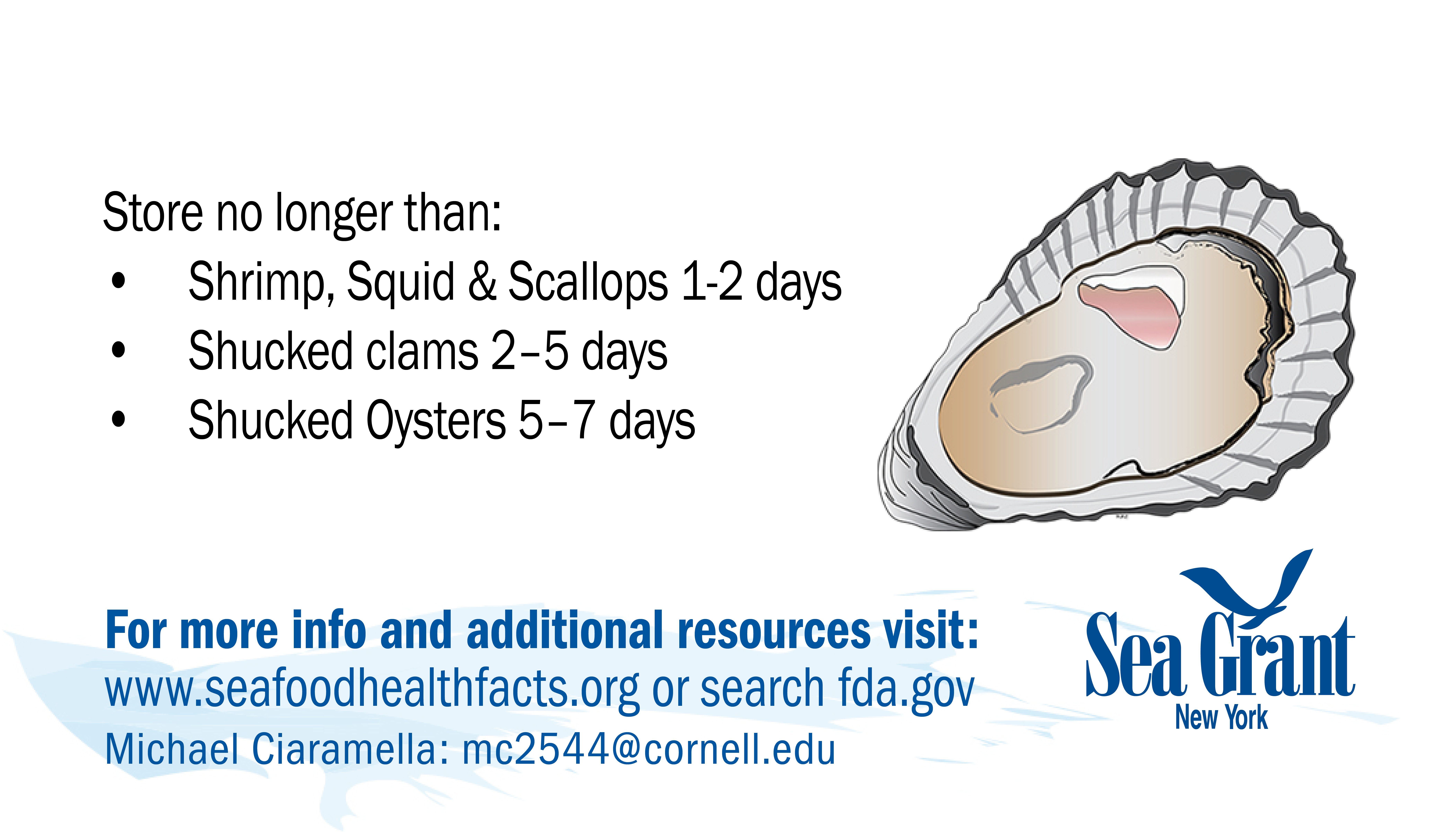 If you have problems downloading any cards or would like them in a different format for use please contact NY Sea Grant's Seafood Specialist: Michael Ciaramella, E: mc2544@cornell.edu, P: (631) 632-8730.