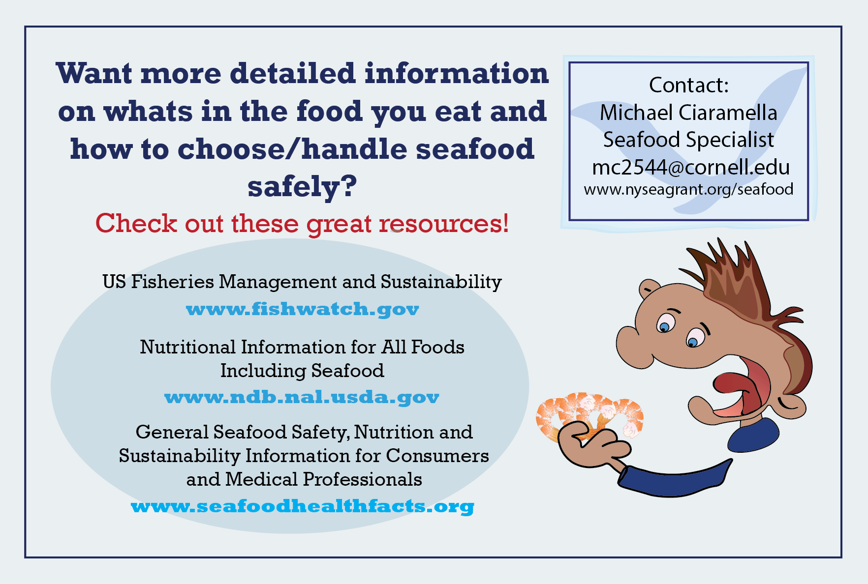 If you have problems downloading any cards or would like them in a different format for use please contact NY Sea Grants Seafood Specialist: