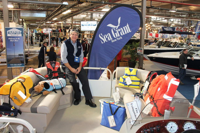 New York Sea Grant Coastal Recreation and Tourism Specialist Dave White with the 10th anniversary edition of the New York Sea Grant Discover Clean and Safe Boating educational vessel. The program adds a Great Lakes Buoys for Boaters introduction in 2017. Photo: Brian P. Whattam