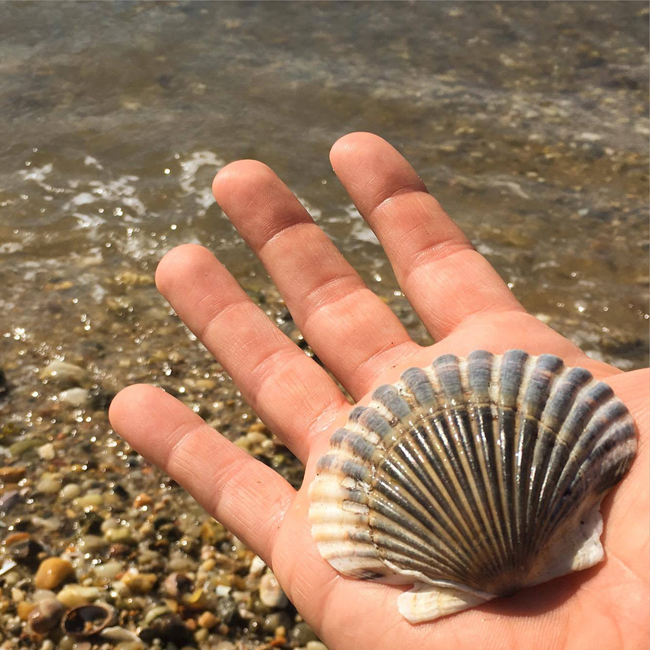 A scallop shell washed ashore in Long Island's Noyac Bay. These and other aquatic filter feeders (oysters, clams, mussels) face survival challenges in bays, estuaries and other waters due to a number of water quality issues, including seasonal acidification and hypoxia, the latter of which signifies low levels of dissolved oxygen in those waters. While pH imbalances in these aquatic environments impede survival of these bivalves, seagrass beds appear to moderate acidic intensifications and provide refuge for the species. Credit: Paul C. Focazio.
