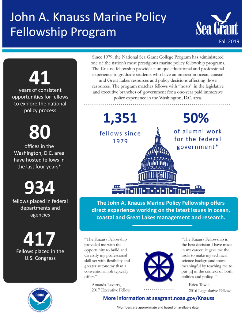 Since 1979, the National Sea Grant College Program has provided one-year fellowships working in federal government offices in Washington, D.C. to over 1,300 early-career professionals. Knauss alumni go on to have prospering careers in all sectors of society.