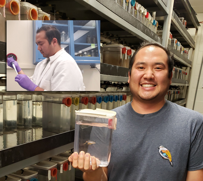 A large portion of Irvin's dissertation research took place in the lab (seen in inset). Irvin, an advanced graduate student at Stony Brook University’s School of Marine and Atmospheric Sciences, uses molecular biology to understand the impacts of pollutants on fish health and survival. He is also pictured in SBU’s zebrafish facility. The zebrafish is a model species that can offer clues to the developmental and behavioral effects of sublethal exposure to pharmaceuticals found in wastewater effluent. Credit: Irvin Huang.