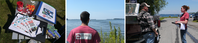 left to right: New York Sea Grant watercraft inspection program resources; watercraft inspection steward at Oswego, N.Y; New York Sea Grant-trained watercraft inspection steward talks with boater along Lake Ontario. Credit: New York Sea Grant.