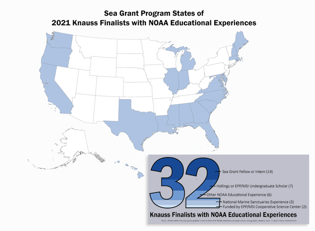 The 32 Knauss finalists who had previously completed other NOAA educational experiences hailed from these 20 state Sea Grant programs. Credit: Sea Grant, copyright: freevectormaps.com; Inset: Thirty-two of the 74 finalists for the 2021 class of the Sea Grant John A. Knauss Marine Policy Fellowship previously completed other NOAA educational experiences. Credit: Sea Grant.