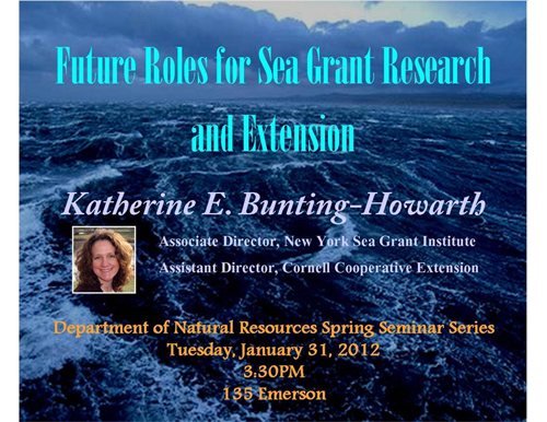 Ithaca, NY, January 27, 2012 - New York Sea Grant Associate Director Katherine Bunting-Howarth will present on "Future Roles for Sea Grant Research and Extension" on Tuesday, January 31 at 3:30 pm in 135 Emerson at Cornell University. Bunting-Howarth's talk kicks off the 2012 Spring Semester seminar series for Cornell University's College of Agricultural and Life Sciences Department of Natural Resources.