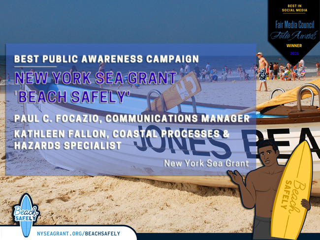 “We are honored that FMC recognized #BEachSAFEly for both its design and effectiveness of conveying valuable health and safety information in an eye-catching way,” said Paul C. Focazio, NYSG's Communications Manager. “The weekly series stood apart from other COVID-19 coastal messaging seen on Facebook, Twitter, and Instagram because it brought in different aspects of water safety, such as wave and rip current awareness.”