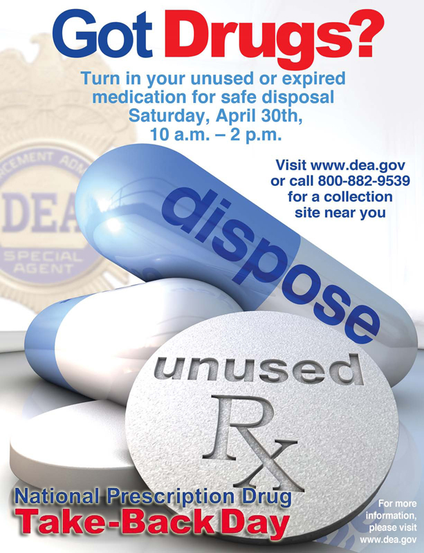 For four hours this Saturday (April 30, 2016)—from 10 am - 2 pm your local time—you can safely dispose of these medicines at a registered site in your community as part of The U.S. Drug Enforcement Agency's (USDEA) "National Prescription Drug Take-Back Day."