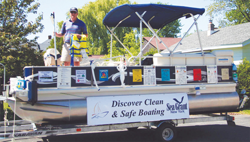 From May to September, NYSG Recreation and Tourism Specialist Dave White embarked on the 2010 upstate NY tour of the Discover Clean & Safe Boat sponsored by Marathon Boat Group, the Boating Industries Association of Upstate NY, Great Lakes Seaway Trail, Morgan Recreational Supply, Taylor Made Products, NYS Parks and the NYS Environmental Facilities Corporation. The 19-ft “Made in New York” Grumman aluminum pontoon boat came off the assembly line in Marathon to educate boaters about required and recommended gear for safe and legal NY boating. NYSG equipped the boat with four types of personal flotation devices (PFDs), safety flares, chartbook, paddle, and a fuel nozzle bib to reduce fuel spills. The boat had two electric motors, a generator and a shoreline recharge plug-in. Boaters at the exhibit who pledged to be “clean, green and safe” spun a wheel for prizes such as a floating keychain, bilge sock, Nautical Seaway Trail Chartbook, poncho and life jacket.