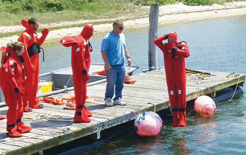 Using funds from the NY Center for Agricultural Medicine and Health (NYCAMH), NYSG and its partners hosted a Safety At Sea (SAS) training workshop at Inlet Seafood Packing House in Montauk. During the free day-long training in June, 46 commercial fishermen and fisheries biologists learned at-sea lifesaving techniques. During a free raffle, the Long Island Occupational and Environmental Health Center (LIOEHC) donated 15 flotation bibs and Dave Aripotch, captain of the Caitlin & Mairead, won the immersion suit grand prize donated by IMP Marine Group of New Bedford, MA. Fishermen practiced safe water entry with immersion suits (pictured). Some fishermen brought their own suits for inspection and when one fifth of the suits failed, those seafarers decided to replace their defective equipment given its lifesaving role.