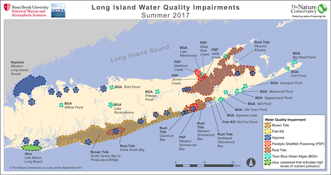 In addition to hypoxia (a deficiency of dissolved oxygen) and blue-green algae, some of the problems found in 2017’s water quality assessment were brown tides on the South Shore, rust tide in the Peconic bays and paralytic shellfish poisoning on the East End — all of which are also nitrogen and/or phosphorous level issues that can be traced back to cesspool sewage and fertilizers. The good news, said Dr. Christopher Gobler at the "State of the Bays" address in early April 2017 at Stony Brook Southampton, is that “politicians are owning the issue,” acknowledging that sub-standard septic systems are responsible for about 2/3 of the nitrogen entering the bays. For more on Long Island's 2017 water quality concerns, see "State of the Bays: Communities Respond to Colorful Tides that Could Signal Harm." Credit: Chris Gobler.