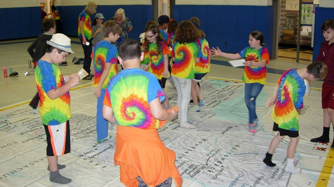 Children walk on the large map to understand the size and topography of New York state. Credit: Matt Savatgy/Cornell Cooperative Extension.