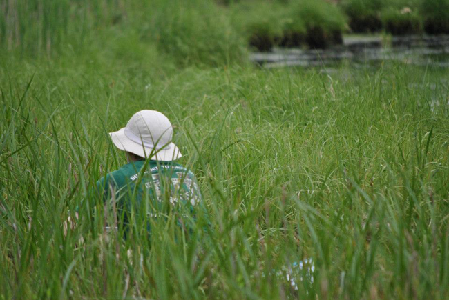 IMG_0291 Former Stony Brook University undergraduate Ashley Moreno at East Creek (Sands Point, NY). Ashley is standing at the transition between Spartina alterniflora (taller grass) and Spartina patens (short, high-marsh grass). You can also see invasive Phragmites australis in the background of this photo.