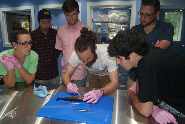 The interns (l-r: Sarah Burke, Justin Chon, Nathaniel Eddy, Matthew Pluschau, Matthew Tobin) with Stephen Frattini (in white t-shirt, center) from the Center for Aquatic Animal Research and Management, whom NYSG partnered with for this program. Credit: All photos courtesy of Mike Ciaramella/NYSG.