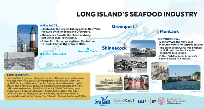 This past summer, NYSG supported the local tourism industry in another way, by partnering with CCE Nassau County to organize an information desk — available throughout July to distribute information about local seafood choices and seafood production — at The Long Island Welcome Center. The center, at eastbound Exit 51-52 on the Long Island Expressway, opened on Oct. 20, 2016 and reportedly welcomes nearly 8,000 people a day. “Tourism and agriculture are critical drivers of the Long Island economy and with the new Welcome Center, we are making smart investments to support these industries throughout the region,” said New York Governor Andrew Cuomo. For more posters from this effort, see "NYSG Summer 2018 Intern Encourages Support for Local Fishing Businesses." Credit: Design by Loriann Cody.
