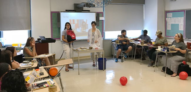 NYSG educators Helen Cheng, left, and Nordica Holochuck introduce climate go-bags to NYC teacher workshop participants. Credit: NYSG/Ryan Strother.