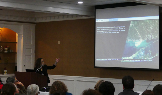 Maria Tzortziou of the City College of New York presents her research titled “Satellite Ocean Color Observations from NASA's PACE Mission: Addressing Environmental Challenges and Enhancing Environmental Management Decisions.” Credit: Ryan Strother / NYSG.