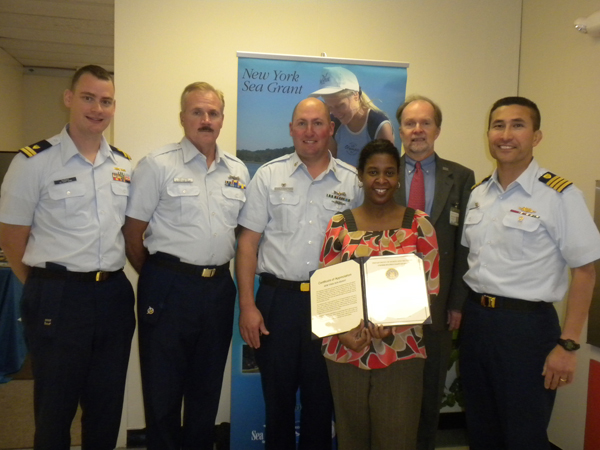At the October 24 ceremony are, from left to right: Lt. Christian J. Barger, USCG Marine Safety Detachment Supervisor, Coram; Capt. Bill Nelson, Coast Guard Auxiliary; Officer in Training BMCS Jason Walter, USCG Station Montauk; Antoinette Clemetson, NYSG Fisheries Specialist; Dr. Jim Ammerman, NYSG Director; and Captain Joseph M. Vojvodich, USCG regional commander for Sector Long Island Sound Sector.