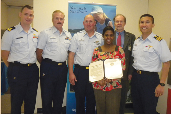 NYSG Fisheries Specialist Antoinette Clemetson (pictured below), organizer of the 2010-2011 Safety-At-Sea training program, was presented with a Certificate of Appreciation for outstanding outreach (left to right) by Captain Joseph M. Vojvodich, US Coast Guard regional commander for Sector LIS during a 40th anniversary ceremony at Stony Brook University. The USCG was an important partner in this successful program. From left to right: Lt. Christian J. Barger, USCG Marine Safety Detachment Supervisor; Capt. Bill Nelson, USCG Auxiliary; Officer in Training BMCS Jason Walter; Clemetson; Dr. Jim Ammerman, NYSG Director; and Capt. Vojvodich.