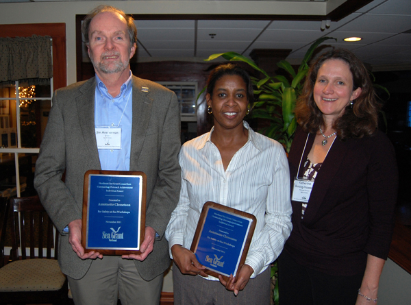 For this project, NYSG Fisheries Specialist Antoinette Clemetson also received the Northeast Sea Grant Consortium Outstanding Outreach Achievement Award. She is pictured below at the Northeast Sea Grant's November 2011 regional meeting in Newport, Rhode Island flanked by NYSG's Director Dr. James Ammerman (far left) and NYSG Associate Director Dr. Kathy Bunting-Howarth (far right).