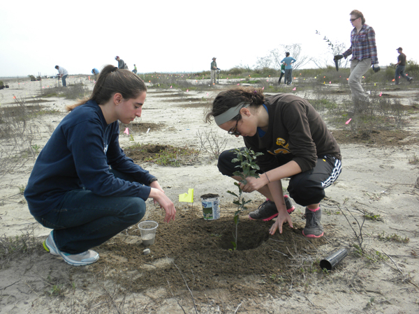 During this year's trip, the NYSMEA/NYSG educators, along with students from Massachusetts' Brandeis University, worked with the Barataria-Terrebonne National Estuary Program (BTNEP) to plant approximately 500 live oak, sand oak, and hackberry trees on a restored ridge re-created from dredged sediments that were excavated during dredging in Port Fourchon. With this and future plantings, this ridge will one day become a mature maritime forest—a crucial habitat that provides food and shelter for birds during their migration routes.