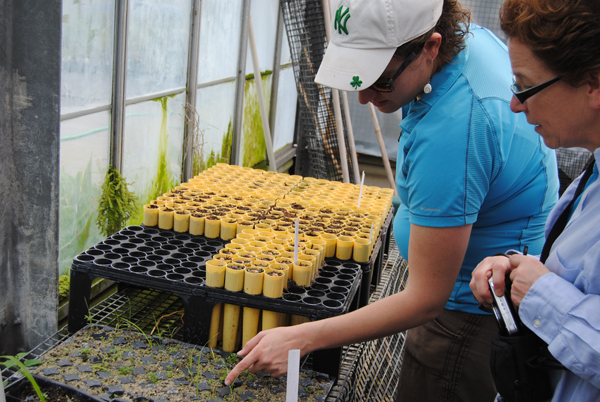 Educator Elizabeth Yanuck-Platt is pictured above with New York Sea Grant's Long Island Sound Study educator Larissa Graham at the Golden Meadow Plant Materials Center, where she and other educators propagated restoration plants including Gulf bluestem by clipping fully-grown ones, placing several clippings in separate sections in a tray and then trimming the clippings to spur additional growth and increase their chances for survival.