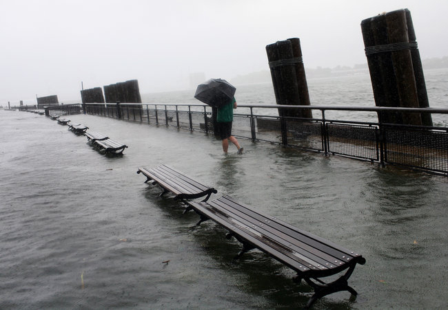 Battery Park after Hurricane Irene, by then a tropical storm, hit a year ago. Low-lying areas of New York City are vulnerable to storms.