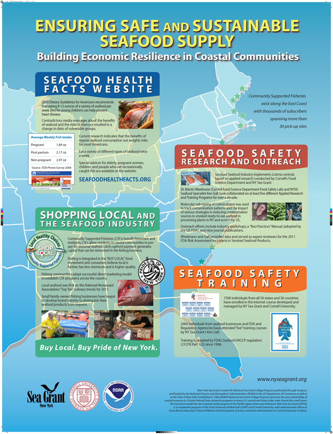 Staff from NYSG, a cooperative program of Cornell University and the State University of New York, will be on-hand to unveil the program's new poster on "Rethinking the Seafood Industry: Building Economic Resilience in Coastal Communities" (pdf). The poster is filled with healthy eating tips and suggestions on how to shop local as well as topical NYSG-funded research projects and education efforts.