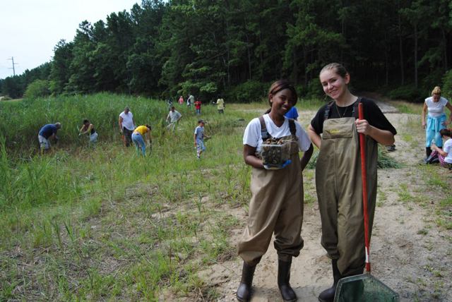Volunteers came out to Brookhaven State Park on Saturday, August 11, 2012 to remove Phragmites and collect invasive Chinese mystery snails. Photo courtesy of Long Island Sound Study. They were all wise to wear their long pants and rubber boots, and come equipped with work gloves, sunscreen and bug spray.