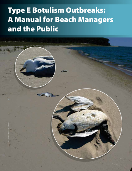 Type E Botulism Outbreaks: A Manual for Beach Managers and the Public provides a detailed look at the biology of the naturally occurring bacterium—Clostridium botulinum—that causes botulism, including where it occurs and how it is transmitted. The 32-page publication provides specific guidance for detecting and reporting infected animals, as well as the removal and handling of dead fish and waterfowl. And although type E botulism poses little threat to human health, the manual also describes basic handling and cooking precautions that consumers can follow to further reduce the risk to themselves.