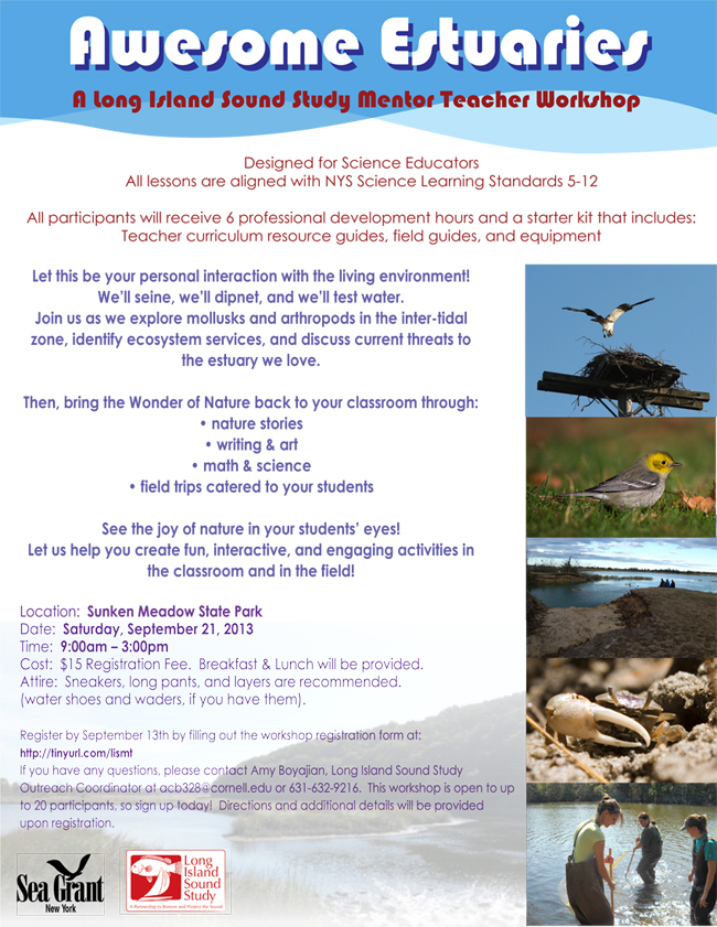 New York Sea Grant and the Long Island Sound Study invite you to attend the Long Island Sound Mentor Teacher Workshops.