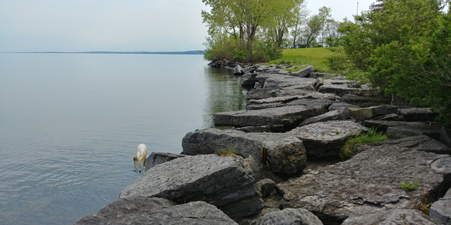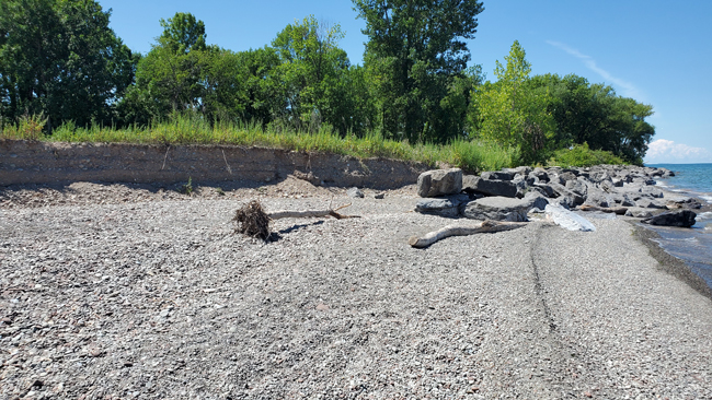 Shoreline erosion can be accelerated adjacent to man-made features, where deflection of waves can attack unprotected shorelines with more energy. Planning for erosion management with neighboring property owners (or managers) can help improve the resiliency of a shoreline (like this one in Port Bay, NY) to lake erosion. Credit: New York Sea Grant/Roy L. Widrig