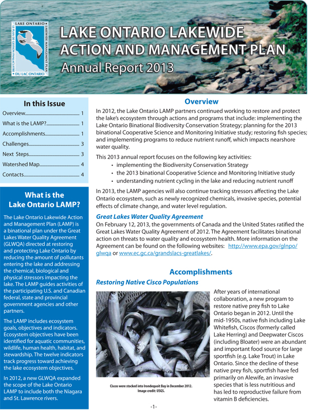 The Lake Ontario LAMP is a binational, cooperative plan to restore and protect the health of Lake Ontario by reducing chemical pollutants and addressing the biological and physical factors impacting the lake. The LAMP guides the activities of U.S. and Canadian federal, state and provincial government agencies, and diverse stakeholder organizations. Learn more by visiting