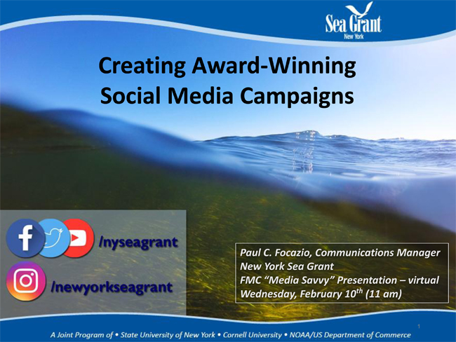 February's workshop on how to create an award-winning social media campaign was taught by New York Sea Grant (NYSG) Assistant Director of Community Relations Paul C. Focazio. Highlighted in Focazio's talk were two FMC Folio Award-winning NYSG campaigns: 2020's "Currents Clips" limited video series and 2014's science-based information released before, during, and after Superstorm Sandy.