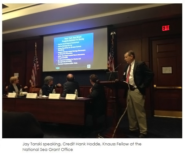 Friday, November 22, 2013, Washington, DC - Staff and stakeholders of the National Oceanic and Atmospheric Administration (NOAA) held a congressional briefing on NOAA’s role in supporting coastal communities before, during, and after Sandy’s impact. The briefing took place on Wednesday November 20th, 2013, just weeks after the one year anniversary of the devastating coastal storm. Representatives from across the NOAA spectrum spoke discussing a wide range of issues including National Weather Service forecasting, National Marine Fisheries Service rapid fisheries stock assessment and the “boots on the ground” approach of New York Sea Grant. The talks highlighted best practices that helped communities and decision-makers during the difficult time leading up to and after Sandy, as well as the important lessons learned to prepare for future storms. The engaging presentations offered a succinct follow-up, summarizing NOAA’s overall response to Sandy.