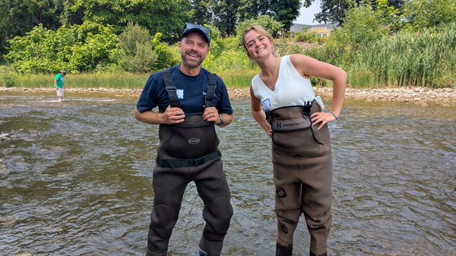 At GLEEE Workshop on August 4th, NYSG Great Lakes Literary Specialist Nate Drag (at left, pictured with Summer 2025 Community Engaged Intern Isabel Hahl) led participants in a streamside mussel survey, which is used to help determine how many mussels are present in our waterways. Credit: Nate Drag/NYSG