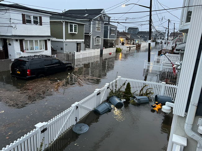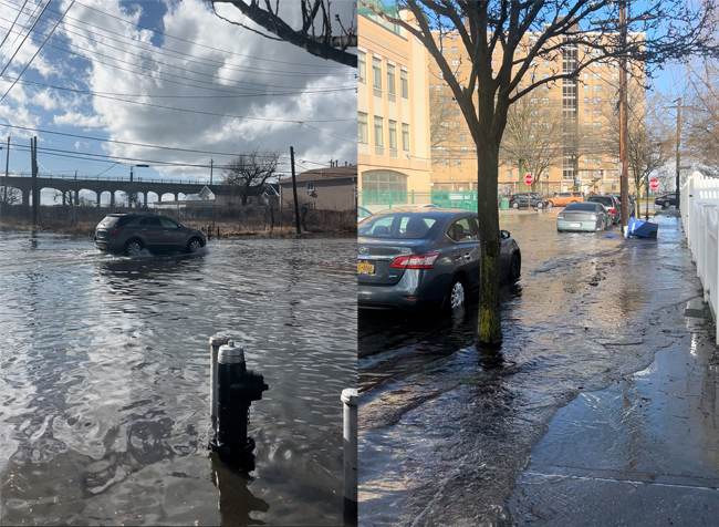Photos taken in Edgemere, Queens, on Julien's residential block on Beach 41st Street and Rockaway Beach Boulevard. (at left) A car drives through floodwaters on Beach 41st Street and Rockaway Beach Boulevard. (at right) A picture of the flooded Beach 41st Street, located between Rockaway Beach Boulevard and Beach Channel Drive. Credit: Mel Julian