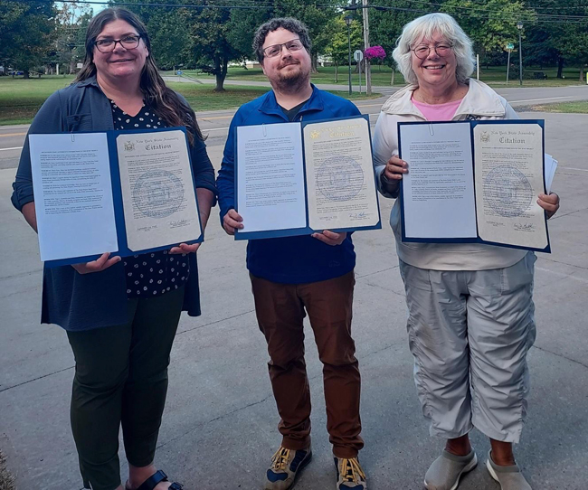 (L-R): New York Sea Grant (NYSG) Great Lakes Coastal Community Development Specialist Mary Austerman, NYSG Coastal Processes and Hazards Specialist Roy Widrig, and Sodus Point resident Laurie Hayden with their NYS Assembly Citations for work on The Dune Project in the Sodus Point community. Credit: NYS Assembly