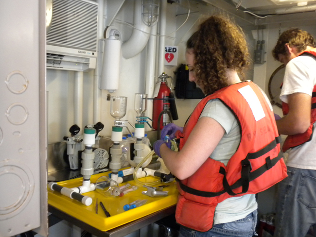 Sea Grant scholar Elizabeth Suter sets up a filtration manifold. It collects samples to measure chlorophyll a. The student next to Suter is Jake Kalda, a former undergraduate in their lab that was collecting samples to measure nutrient concentrations.
