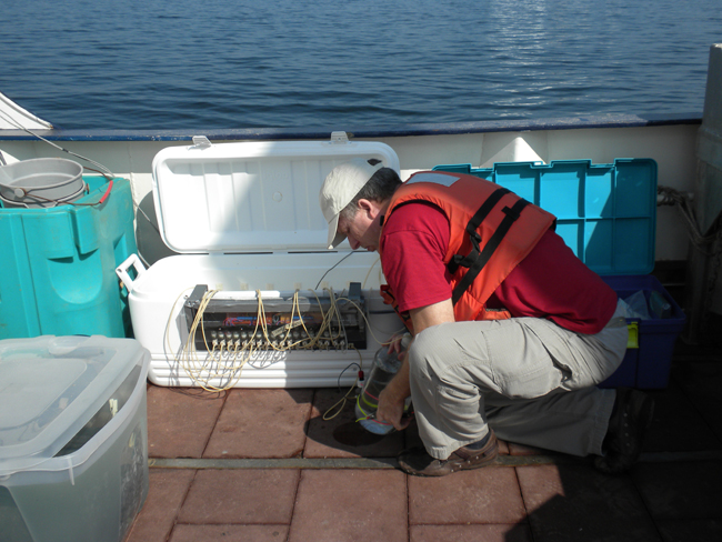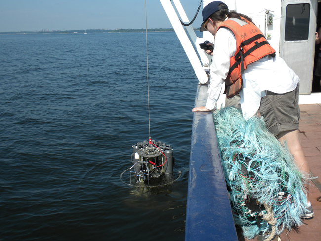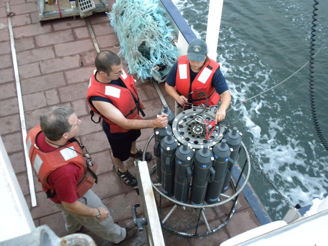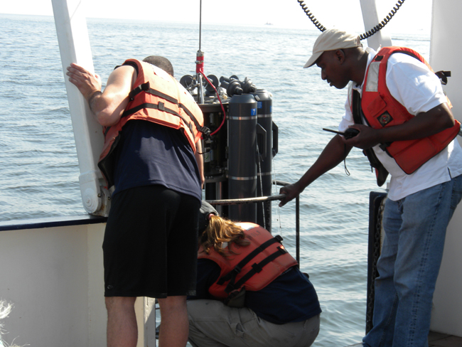 NYSG-funded researcher Kamazima M. Lwiza (at far right) leads others on this investigative team during a water sampling session using a rosette, which (as seen above and below) is being lowered into Long Island Sound.